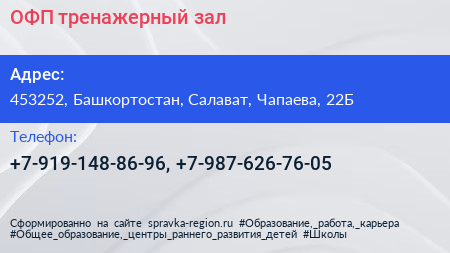 ОФП, тренажерный зал по адресу 453252, Башкортостан, Салават, Чапаева, 22Б в дальнейшем Организация, размещена в следующих категориях:
