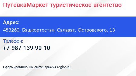 ПутевкаМаркет, туристическое агентство по адресу 453260, Башкортостан, Салават, Островского, 13 в дальнейшем Организация, размещена в следующих категориях: