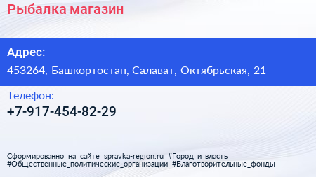 Рыбалка, магазин по адресу 453264, Башкортостан, Салават, Октябрьская, 21 в дальнейшем Организация, размещена в следующих категориях: