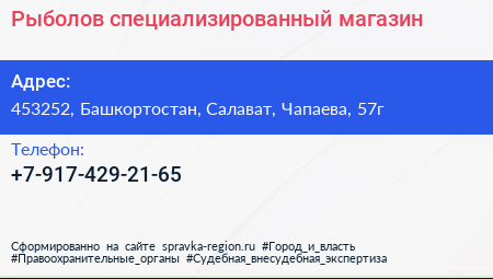Рыболов, специализированный магазин по адресу 453252, Башкортостан, Салават, Чапаева, 57г в дальнейшем Организация, размещена в следующих категориях: