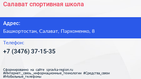 Салават, спортивная школа по адресу Башкортостан, Салават, Пархоменко, 8 в дальнейшем Организация, размещена в следующих категориях: