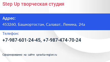 Step-Up, творческая студия по адресу 453260, Башкортостан, Салават, Ленина, 24а в дальнейшем Организация, размещена в следующих категориях: