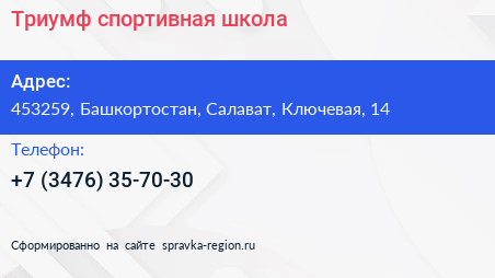 Триумф, спортивная школа по адресу 453259, Башкортостан, Салават, Ключевая, 14 в дальнейшем Организация, размещена в следующих категориях: