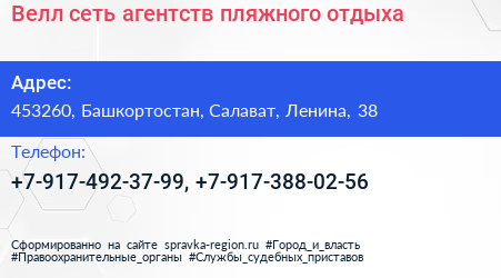 Велл, сеть агентств пляжного отдыха по адресу 453260, Башкортостан, Салават, Ленина, 38 в дальнейшем Организация, размещена в следующих категориях: