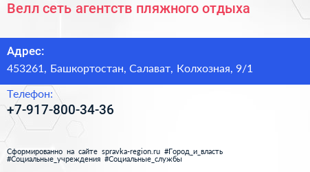Велл, сеть агентств пляжного отдыха по адресу 453261, Башкортостан, Салават, Колхозная, 9/1 в дальнейшем Организация, размещена в следующих категориях: