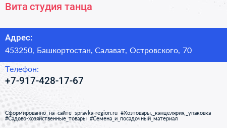 Вита, студия танца по адресу 453250, Башкортостан, Салават, Островского, 70 в дальнейшем Организация, размещена в следующих категориях: