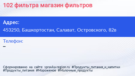 102 фильтра, магазин фильтров по адресу 453250, Башкортостан, Салават, Островского, 82в в дальнейшем Организация, размещена в следующих категориях: