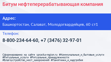Битум, нефтеперерабатывающая компания по адресу Башкортостан, Салават, Молодогвардейцев, 60 ст1 в дальнейшем Организация, размещена в следующих категориях: