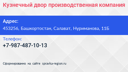 Кузнечный двор, производственная компания по адресу 453256, Башкортостан, Салават, Нуриманова, 11Б в дальнейшем Организация, размещена в следующих категориях: