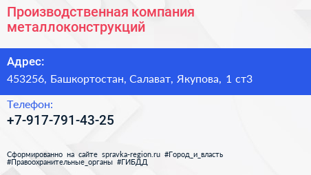 Производственная компания металлоконструкций по адресу 453256, Башкортостан, Салават, Якупова, 1 ст3 в дальнейшем Организация, размещена в следующих категориях: