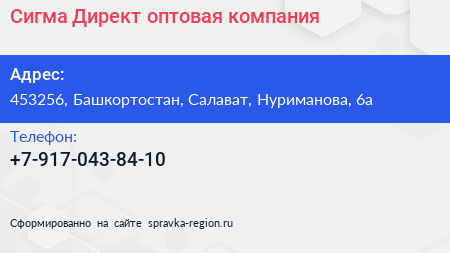 Сигма Директ, оптовая компания по адресу 453256, Башкортостан, Салават, Нуриманова, 6а в дальнейшем Организация, размещена в следующих категориях:
