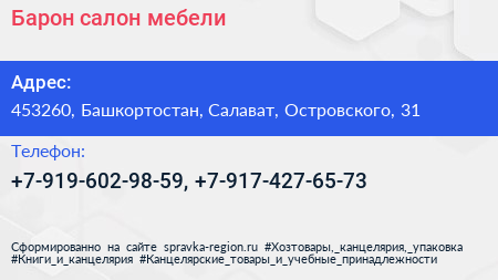 Барон, салон мебели по адресу 453260, Башкортостан, Салават, Островского, 31 в дальнейшем Организация, размещена в следующих категориях: