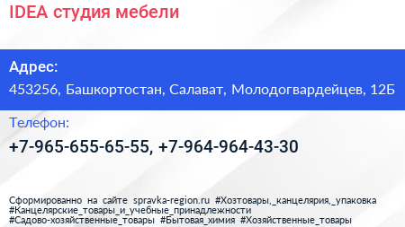 IDEA, студия мебели по адресу 453256, Башкортостан, Салават, Молодогвардейцев, 12Б в дальнейшем Организация, размещена в следующих категориях: