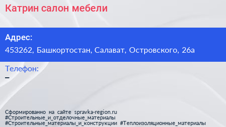 Катрин, салон мебели по адресу 453262, Башкортостан, Салават, Островского, 26а в дальнейшем Организация, размещена в следующих категориях: