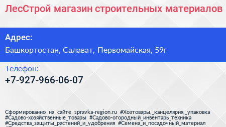 ЛесСтрой, магазин строительных материалов по адресу Башкортостан, Салават, Первомайская, 59г в дальнейшем Организация, размещена в следующих категориях: