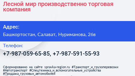 Лесной мир, производственно-торговая компания по адресу Башкортостан, Салават, Нуриманова, 26в в дальнейшем Организация, размещена в следующих категориях: