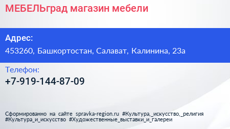 МЕБЕЛЬград, магазин мебели по адресу 453260, Башкортостан, Салават, Калинина, 23а в дальнейшем Организация, размещена в следующих категориях: