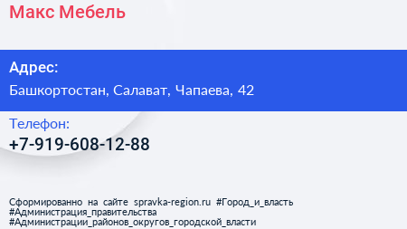 Макс-Мебель по адресу Башкортостан, Салават, Чапаева, 42 в дальнейшем Организация, размещена в следующих категориях:
