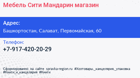 Мебель-Сити-Мандарин, магазин по адресу Башкортостан, Салават, Первомайская, 60 в дальнейшем Организация, размещена в следующих категориях: