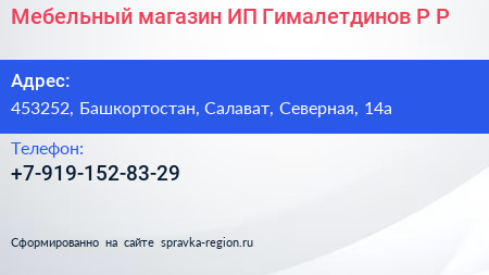 Мебельный магазин, ИП Гималетдинов Р.Р. по адресу 453252, Башкортостан, Салават, Северная, 14а в дальнейшем Организация, размещена в следующих категориях:
