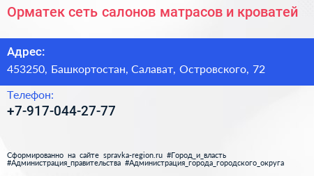 Орматек, сеть салонов матрасов и кроватей по адресу 453250, Башкортостан, Салават, Островского, 72 в дальнейшем Организация, размещена в следующих категориях:
