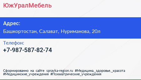 ЮжУралМебель по адресу Башкортостан, Салават, Нуриманова, 20л в дальнейшем Организация, размещена в следующих категориях: