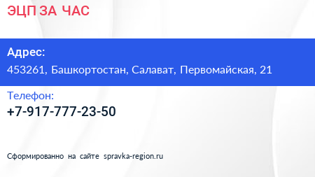 ЭЦП ЗА ЧАС по адресу 453261, Башкортостан, Салават, Первомайская, 21 в дальнейшем Организация, размещена в следующих категориях: