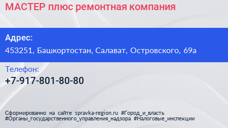 МАСТЕР плюс, ремонтная компания по адресу 453251, Башкортостан, Салават, Островского, 69а в дальнейшем Организация, размещена в следующих категориях: