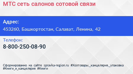 МТС, сеть салонов сотовой связи по адресу 453260, Башкортостан, Салават, Ленина, 42 в дальнейшем Организация, размещена в следующих категориях: