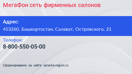 МегаФон, сеть фирменных салонов по адресу 453260, Башкортостан, Салават, Островского, 21 в дальнейшем Организация, размещена в следующих категориях: