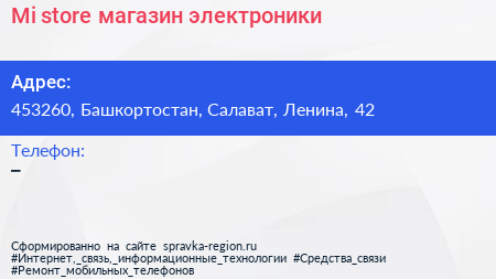 Mi store, магазин электроники по адресу 453260, Башкортостан, Салават, Ленина, 42 в дальнейшем Организация, размещена в следующих категориях: