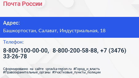 Почта России по адресу Башкортостан, Салават, Индустриальная, 18 в дальнейшем Организация, размещена в следующих категориях: