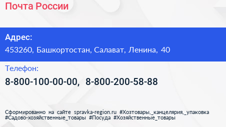 Почта России по адресу 453260, Башкортостан, Салават, Ленина, 40 в дальнейшем Организация, размещена в следующих категориях: