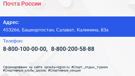 Почта России по адресу 453266, Башкортостан, Салават, Калинина, 83а в дальнейшем Организация, размещена в следующих категориях: