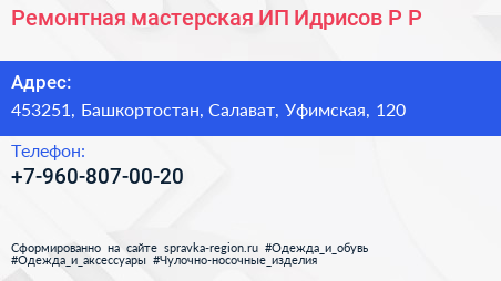Ремонтная мастерская, ИП Идрисов Р.Р. по адресу 453251, Башкортостан, Салават, Уфимская, 120 в дальнейшем Организация, размещена в следующих категориях: