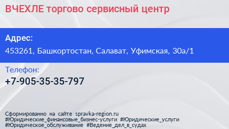 ВЧЕХЛЕ, торгово-сервисный центр по адресу 453261, Башкортостан, Салават, Уфимская, 30а/1 в дальнейшем Организация, размещена в следующих категориях: