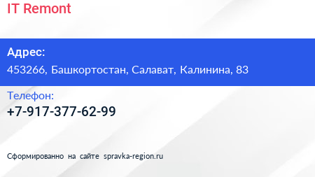 IT Remont по адресу 453266, Башкортостан, Салават, Калинина, 83 в дальнейшем Организация, размещена в следующих категориях: