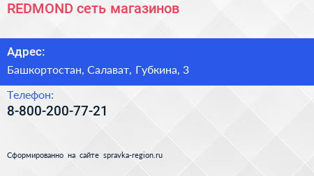 REDMOND, сеть магазинов по адресу Башкортостан, Салават, Губкина, 3 в дальнейшем Организация, размещена в следующих категориях: