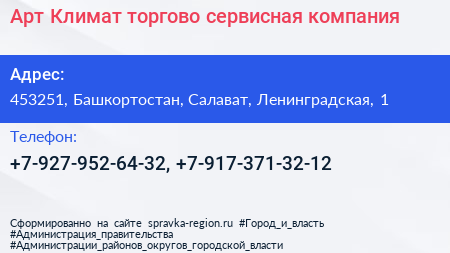 Арт-Климат, торгово-сервисная компания по адресу 453251, Башкортостан, Салават, Ленинградская, 1 в дальнейшем Организация, размещена в следующих категориях: