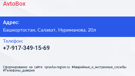 AvtoBox по адресу Башкортостан, Салават, Нуриманова, 20л в дальнейшем Организация, размещена в следующих категориях: