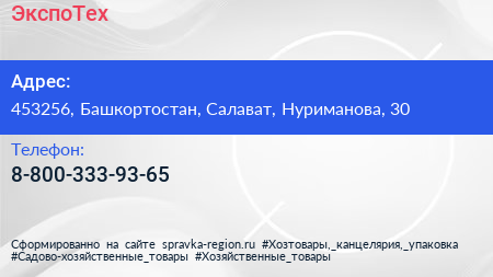 ЭкспоТех по адресу 453256, Башкортостан, Салават, Нуриманова, 30 в дальнейшем Организация, размещена в следующих категориях: