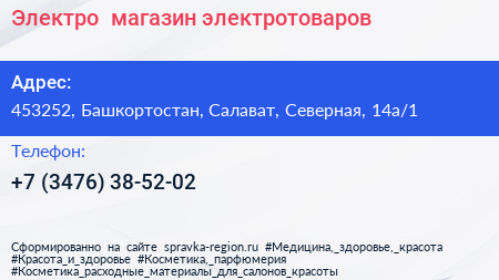 Электро+, магазин электротоваров по адресу 453252, Башкортостан, Салават, Северная, 14а/1 в дальнейшем Организация, размещена в следующих категориях: