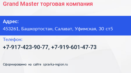 Grand Master, торговая компания по адресу 453261, Башкортостан, Салават, Уфимская, 30 ст5 в дальнейшем Организация, размещена в следующих категориях: