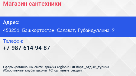 Магазин сантехники по адресу 453251, Башкортостан, Салават, Губайдуллина, 9 в дальнейшем Организация, размещена в следующих категориях: