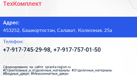 ТехКомплект по адресу 453252, Башкортостан, Салават, Колхозная, 25а в дальнейшем Организация, размещена в следующих категориях:
