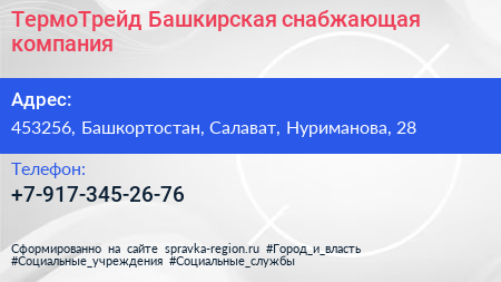 ТермоТрейд, Башкирская снабжающая компания по адресу 453256, Башкортостан, Салават, Нуриманова, 28 в дальнейшем Организация, размещена в следующих категориях:
