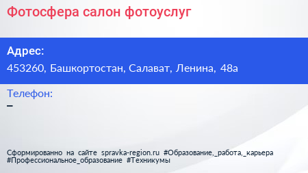 Фотосфера, салон фотоуслуг по адресу 453260, Башкортостан, Салават, Ленина, 48а в дальнейшем Организация, размещена в следующих категориях: