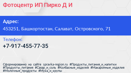 Фотоцентр, ИП Пирко Д.И. по адресу 453251, Башкортостан, Салават, Островского, 71 в дальнейшем Организация, размещена в следующих категориях: