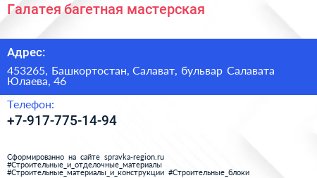 Галатея, багетная мастерская по адресу 453265, Башкортостан, Салават, бульвар Салавата Юлаева, 46 в дальнейшем Организация, размещена в следующих категориях: