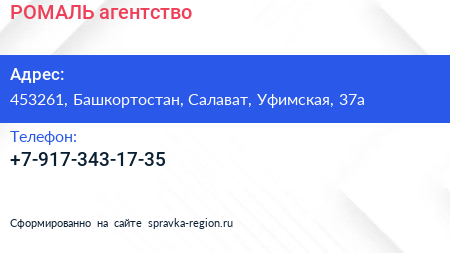 РОМАЛЬ, агентство по адресу 453261, Башкортостан, Салават, Уфимская, 37а в дальнейшем Организация, размещена в следующих категориях: